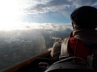 La vessie comprimée par le froid, je me pose aussi. Et je repars dans la foulée afin de tamponner mes trois vols en trois mois. Au remorqueur cette fois car le vent a bien baissé. Et en effet, le largage a 500 m est un peu optimiste. Heureusement il reste quelque souffle, et c'est un Ka6. En zone de gain d'altitude, je remonte aux motos et je peux me relancer en base pour la 30 à la hauteur qui-va-bien.